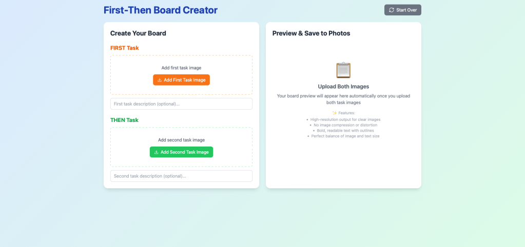 Here it is: First-Then Board Creator was born. That’s how the First–Then Board Creator was born. Below is the interface of the tool.